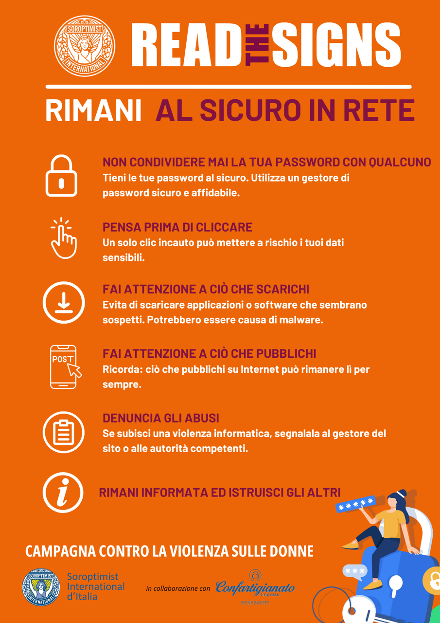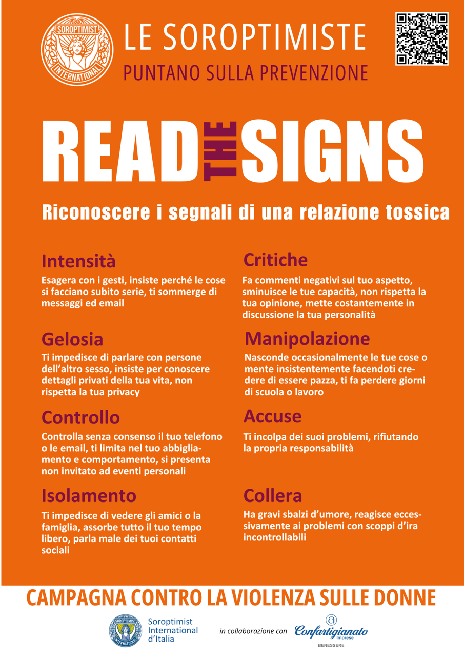 In questo periodo Soroptimist attiva anche la campagna “Read the signes”, dedicata alla diffusione della cultura della prevenzione. L’obiettivo è sensibilizzare e prevenire comportamenti potenzialmente pericolosi — come gelosia, controllo, manipolazione e collera — che possono portare a relazioni tossiche e violente.