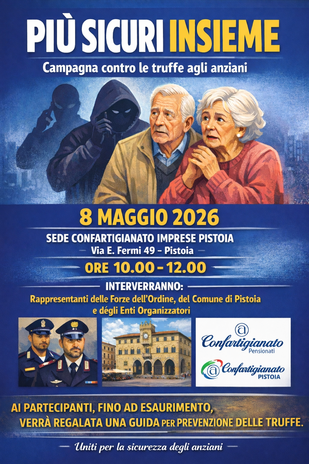 L’appuntamento fa parte della sesta campagna nazionale “Più Sicuri Insieme”, un progetto che vede uniti il Ministero dell’Interno e le Forze dell’Ordine per costruire una rete di protezione intorno agli anziani.